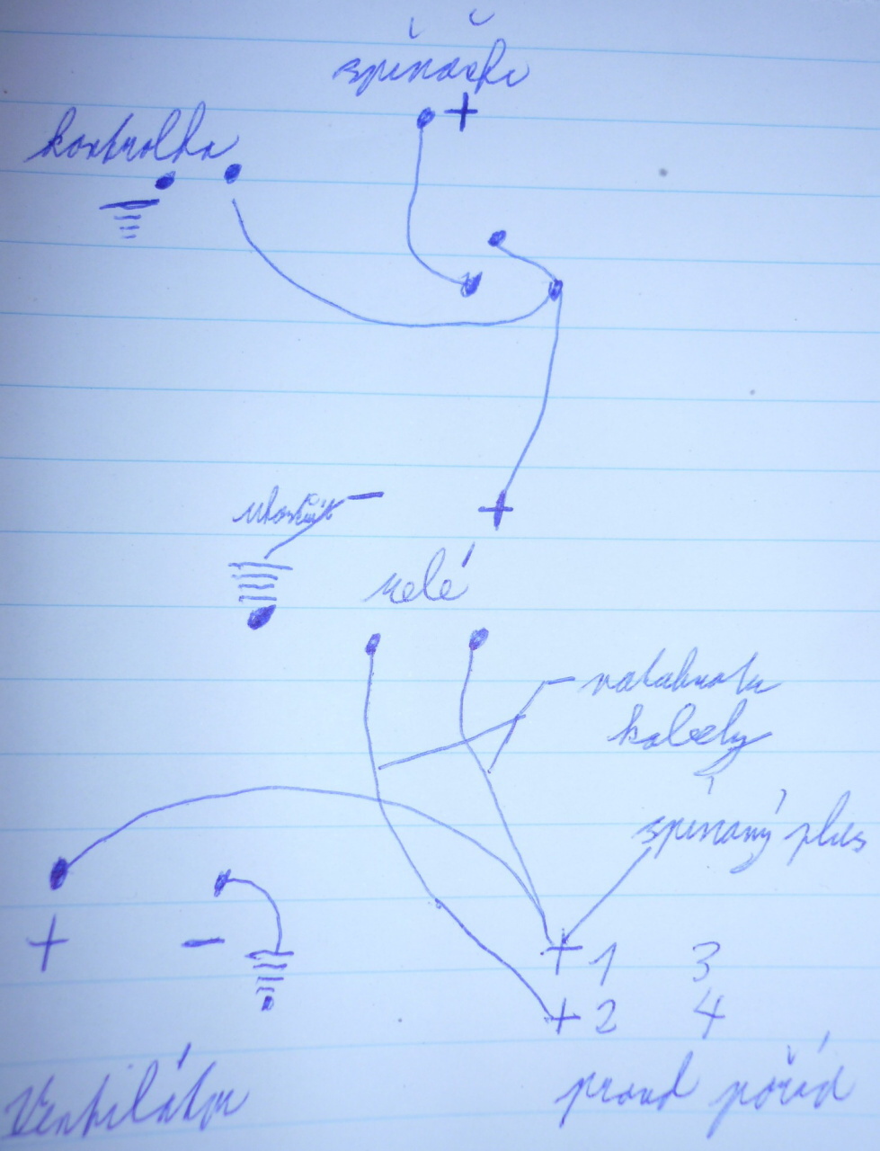 Doplnil jsem okruh ještě o jedno relátko. Proud do relátka pouštím přes přepínač ze spínačky.