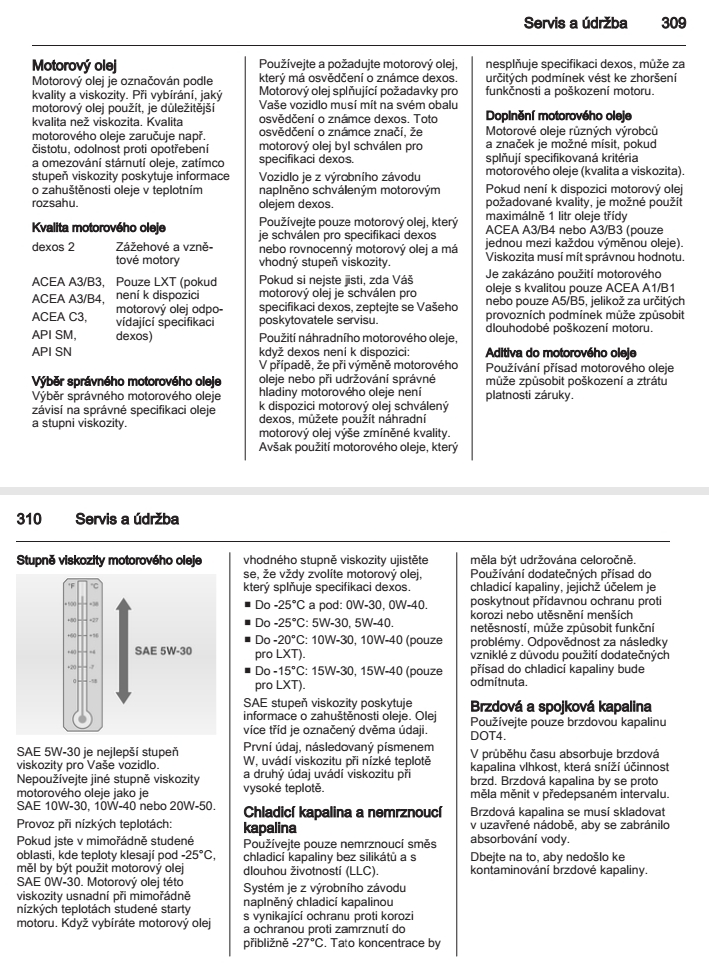 A ještě jsem zapomněl dodat, že jsem tam zkusil i nalít "Metabond ECO do motorů do 3.5t 250ml" to tam mám teď v tom Castrolu. Posílám i fotku z manuálu ohledně olejů.
