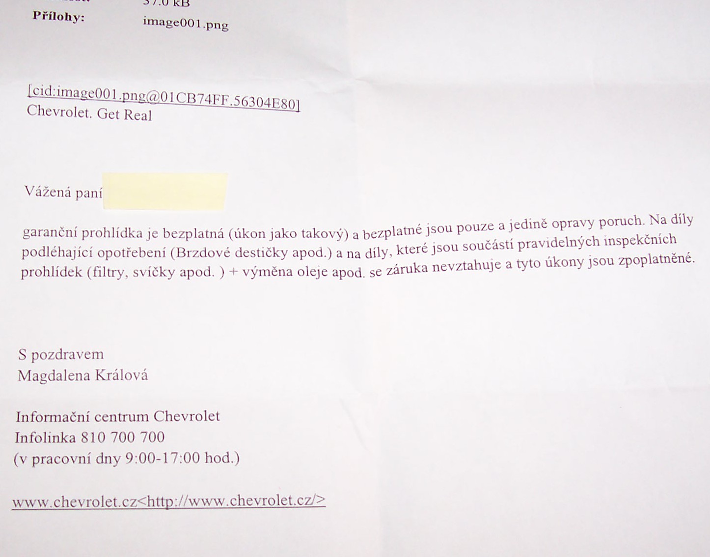 , že o tom nic neví, že jim Chevrolet nic neproplácí. Budou to prý zjišťovat a dají mi vědět, tak trpělivě čekám