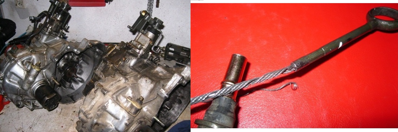 Medzi sviatkami bolo už konečne trocha času na opravu. Tatko rozhodol, že rovno vymeníme celú prevodovku, pretože už ju mal raz dole, kvôli spojke. Nebolo to ťažké, ale zabralo to niekoľko hodín. Šupli sme tam druhú, ktorú sme mali v zálohe z jedného nabúraného Matiza. Všetko sme pozapájali, ale problém bol presne rovnaký a teda chyba nebola v prevodovke ani v kulise. Asi 10 hodín práce na nič, ale aspoň mám čistejšiu a novšiu prevodovku a nový prevodový olej plus tá stará pretekala pod krytom. V každom prípade tatko nakoniec do rána vymenil aj lanká a prišiel na chybu. Môžete to vidieť na fotke, niektoré vlákna sa rozstrapkateli a tak sa lanko od páky zasekávalo v bovdene, a páka teda len krčila lanko a neradila. -i
