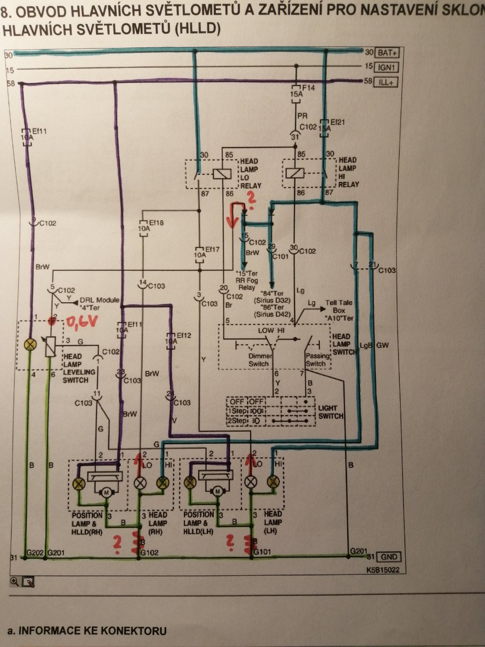 Podařilo se mi sehnat schéma zapojení a tak jsem se v tom trochu pošťoural. Zjistil jsem, že na ovladači sklonu světel by při dálkových nemělo být žádné napětí, ale je tam 0,6V, což nejspíš pošle světlomety do spodní polohy. Prvním místem odkud by se mohlo vzít, jsou diody oddělující obvody dálkových a tlumených světel, ale netuším, jestli pokažená dioda může propouštět v závěrném směru, a navíc nevím, ani kde jsou umístěné. Druhou možností je nedostatečné ukostření žárovek světlometů a to se dá vyzkoušet velice snadno jejich vyndáním ... a ejhle, sklápění funguje tak jak má.